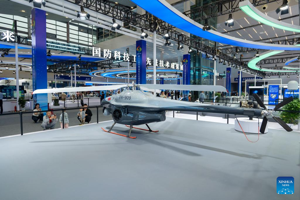 An FH-909 unmanned helicopter is displayed during the 13th China (Mianyang) Science and Technology City International High-Tech Expo in Mianyang, southwest China's Sichuan Province, Sept. 27, 2025. The expo opened here on Friday and will last until Sept. 30, with a core exhibition area of 32,000 square meters for science and technology which focuses on electronic manufacturing technology, new display technology, AI technology and low-altitude economy. (Xinhua/Xue Chen)