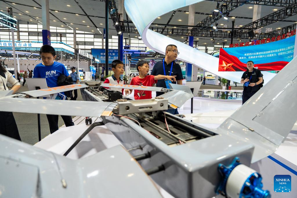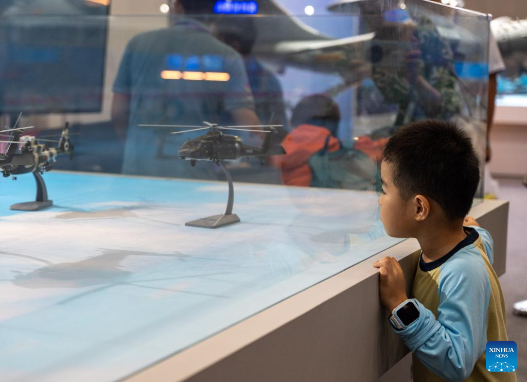 A boy watches helicopter models during the 13th China (Mianyang) Science and Technology City International High-Tech Expo in Mianyang, southwest China's Sichuan Province, Sept. 27, 2025. The expo opened here on Friday and will last until Sept. 30, with a core exhibition area of 32,000 square meters for science and technology which focuses on electronic manufacturing technology, new display technology, AI technology and low-altitude economy. (Xinhua/Xue Chen)