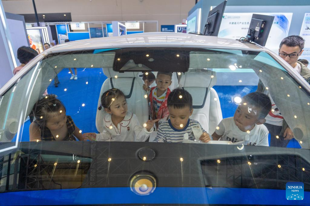 Children learn about a future-concept vehicle during the 13th China (Mianyang) Science and Technology City International High-Tech Expo in Mianyang, southwest China's Sichuan Province, Sept. 27, 2025. The expo opened here on Friday and will last until Sept. 30, with a core exhibition area of 32,000 square meters for science and technology which focuses on electronic manufacturing technology, new display technology, AI technology and low-altitude economy. (Xinhua/Xue Chen)