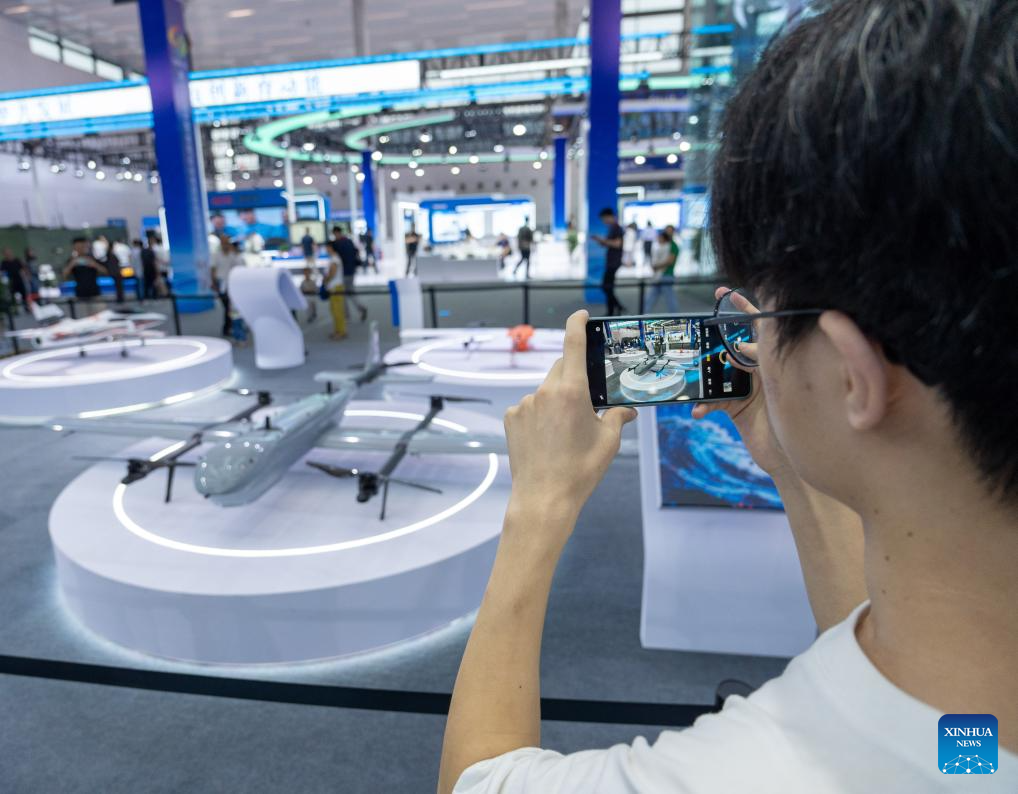 A man takes photos of a survey UAV during the 13th China (Mianyang) Science and Technology City International High-Tech Expo in Mianyang, southwest China's Sichuan Province, Sept. 27, 2025. The expo opened here on Friday and will last until Sept. 30, with a core exhibition area of 32,000 square meters for science and technology which focuses on electronic manufacturing technology, new display technology, AI technology and low-altitude economy. (Xinhua/Xue Chen)