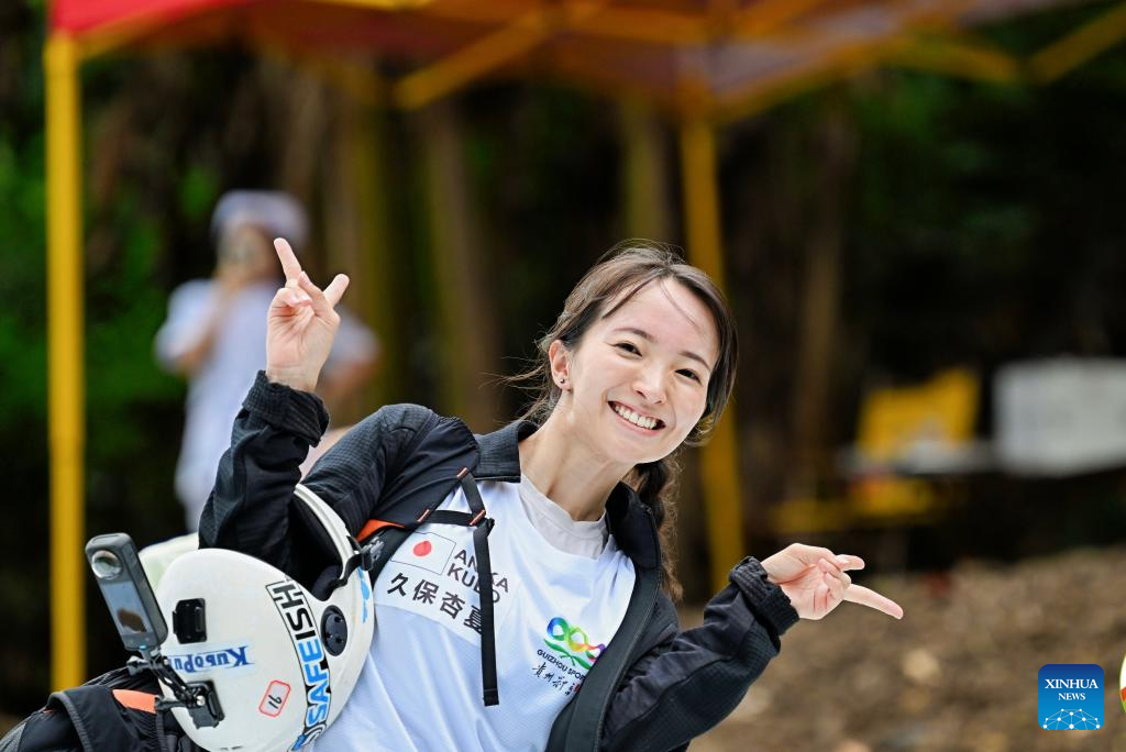 Anika Kubo reacts during the 2025 International High Bridge Extreme Sports Invitational Tournament in Anshun City, southwest China's Guizhou Province, Sept. 26, 2025. (Xinhua)