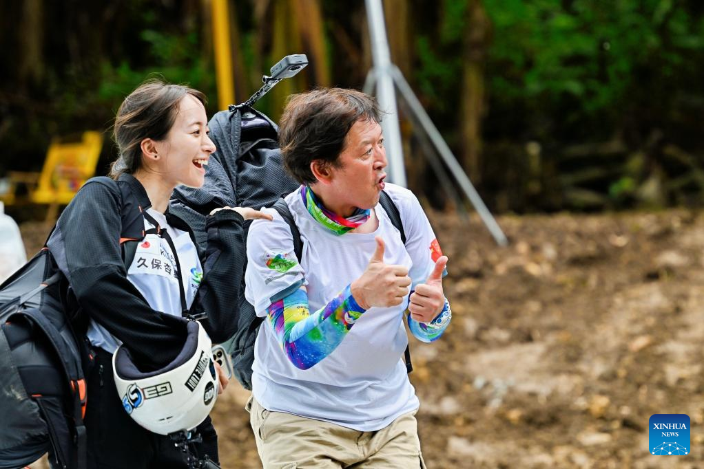 Anika Kubo and her father Yasuhiro Kubo react during the 2025 International High Bridge Extreme Sports Invitational Tournament in Anshun City, southwest China's Guizhou Province, Sept. 26, 2025. (Xinhua)
