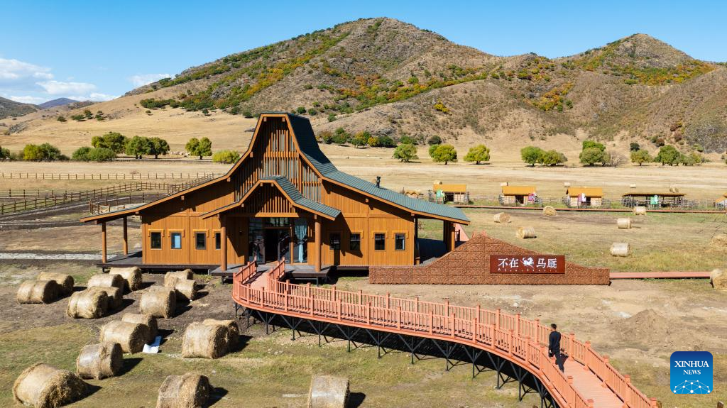 An aerial drone photo taken on Sept. 28, 2025 shows an equestrian base at a scenic area in Horqin Right Wing Front Banner, Hinggan League, north China's Inner Mongolia Autonomous Region. (Xinhua/Bei He)