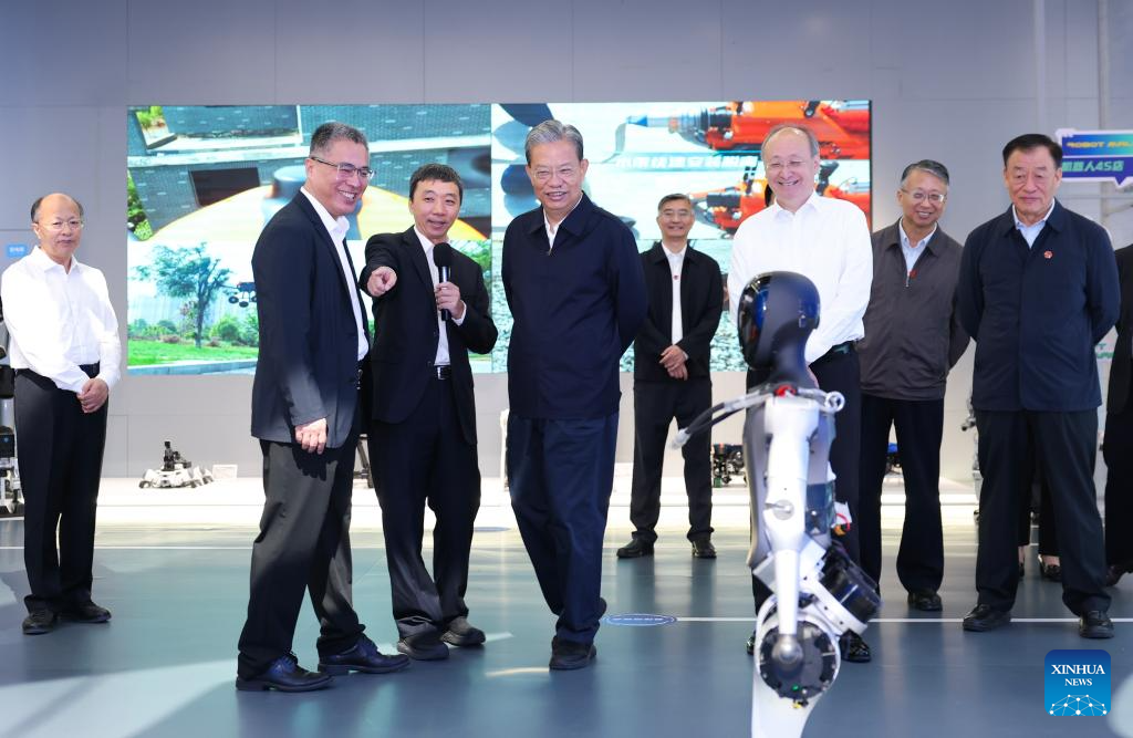 Zhao Leji, a member of the Standing Committee of the Political Bureau of the Communist Party of China Central Committee and chairman of the National People's Congress (NPC) Standing Committee, visits a humanoid robot innovation center in Beijing, capital of China, Sept. 28, 2025. Zhao made an investigation and research tour in Beijing on Sunday. (Xinhua/Huang Jingwen)