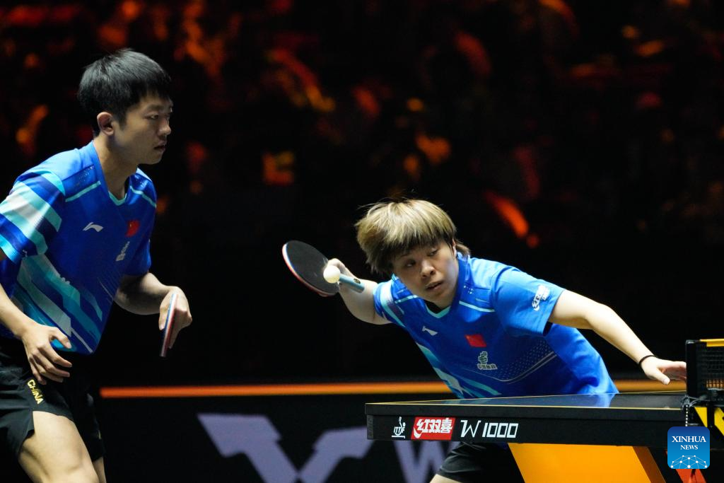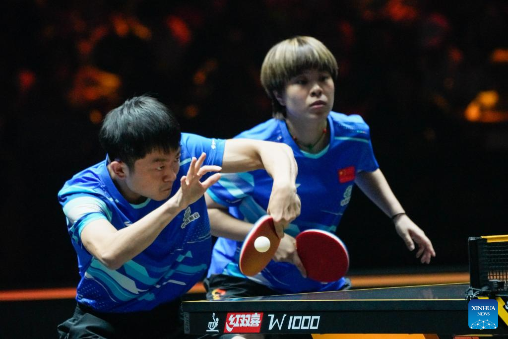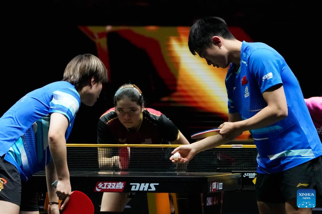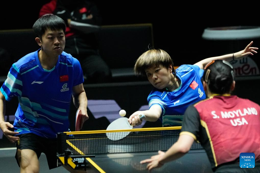 Yuan Licen/Wang Yidi (R) compete during the mixed doulbes round of 32 match between Yuan Licen/Wang Yidi of China and Nandan Naresh/Sally Moyland of the United States at 2025 World Table Tennis (WTT) China Smash in Beijing, China, Sept. 28, 2025. (Xinhua/Xie Han)