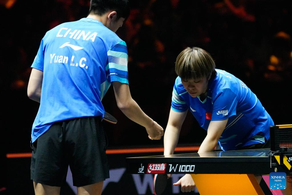 Yuan Licen (L)/Wang Yidi compete during the mixed doulbes round of 32 match between Yuan Licen/Wang Yidi of China and Nandan Naresh/Sally Moyland of the United States at 2025 World Table Tennis (WTT) China Smash in Beijing, China, Sept. 28, 2025. (Xinhua/Xie Han)