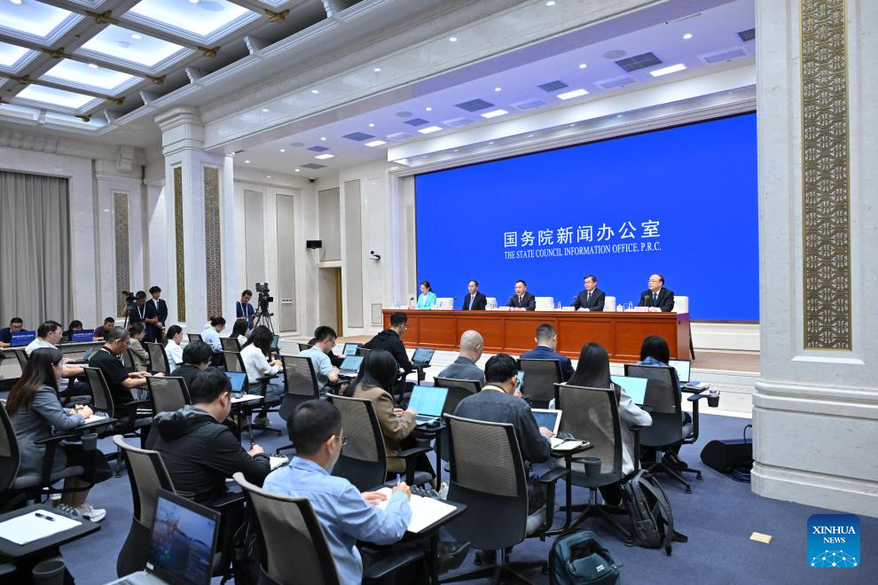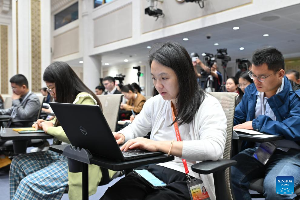 Journalists work at a press conference held by the State Council Information Office (SCIO) on achievements in high-quality development of the water sector during the 14th Five-Year Plan period (2021-2025) in Beijing, capital of China, Sept. 29, 2025. Chinese Minister of Water Resources Li Guoying, Vice Minister of Water Resources Chen Min, and Zhang Xiangwei and Yu Qiyang, both officials of the ministry, attended the press conference here on Monday. (Xinhua/Li Xin)