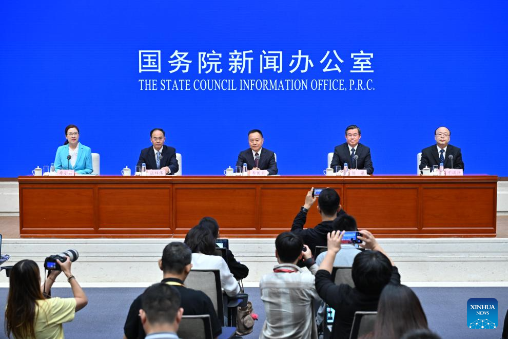 Chinese Minister of Water Resources Li Guoying, Vice Minister of Water Resources Chen Min, and Zhang Xiangwei and Yu Qiyang, both officials of the ministry, attend a press conference held by the State Council Information Office (SCIO) on achievements in high-quality development of the water sector during the 14th Five-Year Plan period (2021-2025) in Beijing, capital of China, Sept. 29, 2025. (Xinhua/Li Xin)