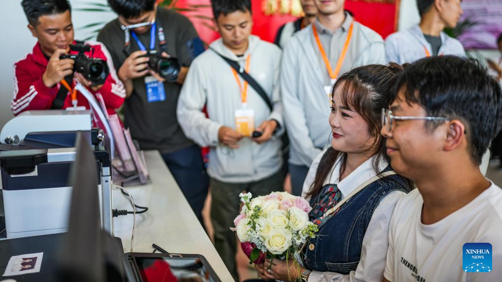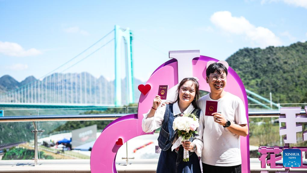 A couple register for marriage at a marriage registration service station near the Huajiang Grand Canyon Bridge in Zhenfeng County, southwest China's Guizhou Province, Sept. 28, 2025. (Xinhua/Tao Liang)