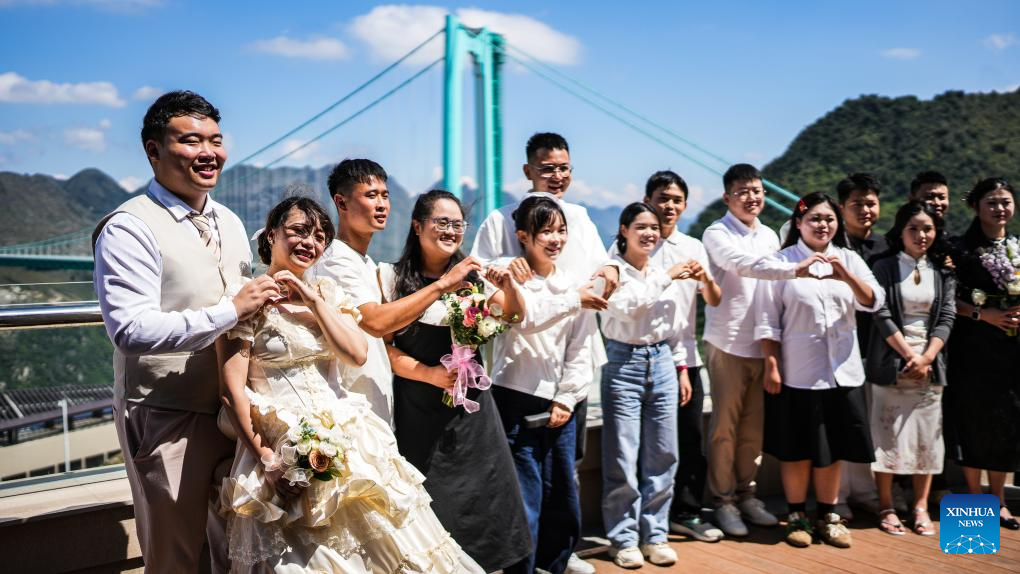 The newlyweds who have obtained their marriage certificates pose for a photo on the terrace of Yundu service area near the Huajiang Grand Canyon Bridge in Zhenfeng County, southwest China's Guizhou Province, Sept. 28, 2025. (Xinhua/Tao Liang)