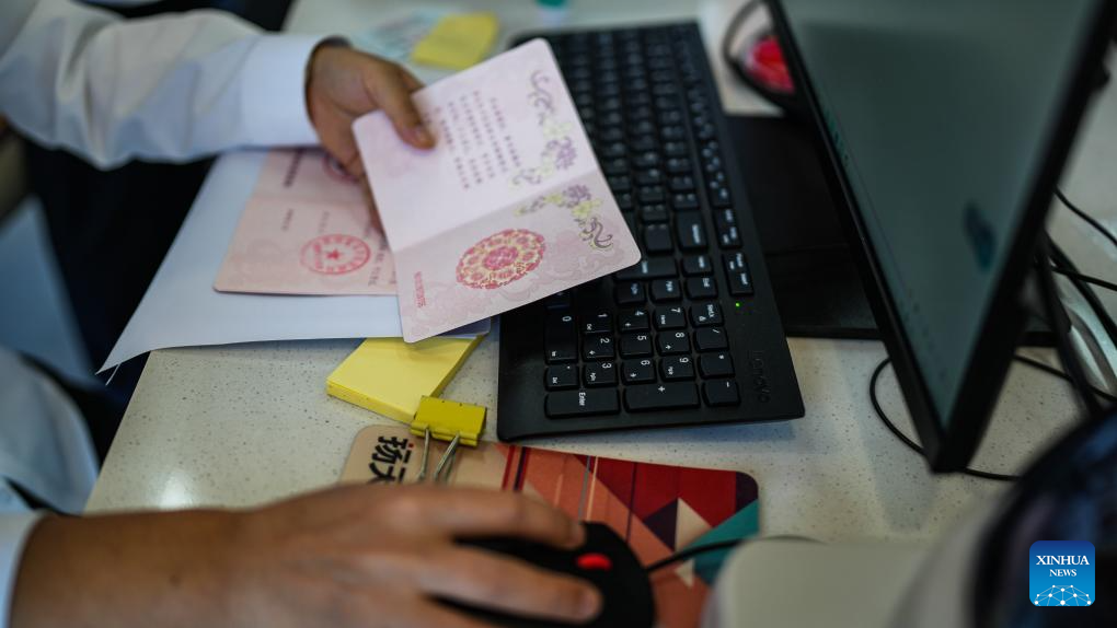 A staff member makes marriage certificates for a couple at a marriage registration service station near the Huajiang Grand Canyon Bridge in Zhenfeng County, southwest China's Guizhou Province, Sept. 28, 2025. (Xinhua/Tao Liang)