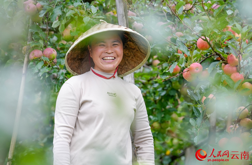 A villager smiles at an orchard in Lijiazhuang villager group, Meixi village in Cangshanxi town, Yangbi Yi Autonomous County, southwest China's Yunnan Province. (People's Daily Online/Hu Zunhui)