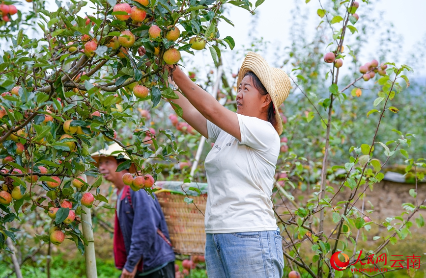 A villager picks apples in Lijiazhuang villager group, Meixi village in Cangshanxi town, Yangbi Yi Autonomous County, southwest China's Yunnan Province. (People's Daily Online/Hu Zunhui)