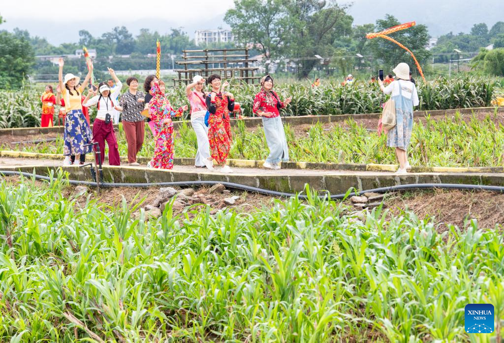 Tourists take a group photo during a rural art fair in Jiangjun Village, Bishan District, southwest China's Chongqing Municipality, Sept. 29, 2025. (Xinhua/Tang Yi)