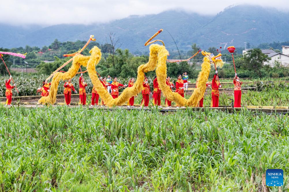 Villagers perform a dragon dance in Jiangjun Village, Bishan District, southwest China's Chongqing Municipality, Sept. 29, 2025. (Xinhua/Tang Yi)