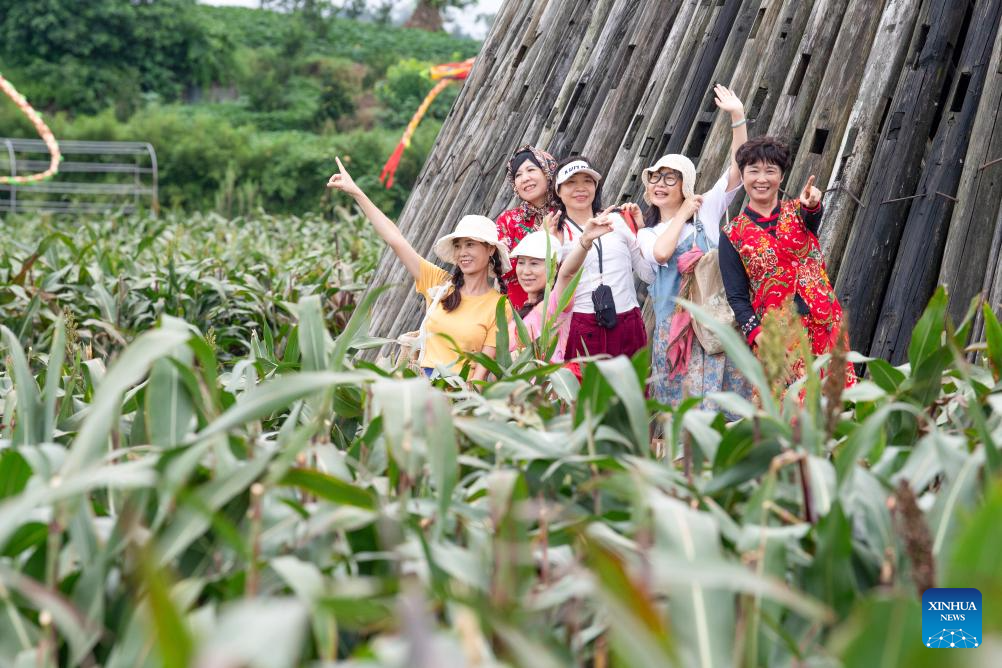 Tourists pose for a group photo during a rural art fair in Jiangjun Village, Bishan District, southwest China's Chongqing Municipality, Sept. 29, 2025. (Xinhua/Tang Yi)