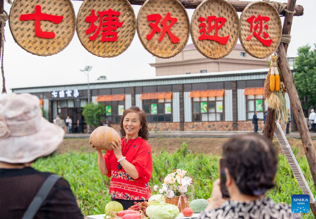 A visitor poses for a photo during a rural art fair in Jiangjun Village, Bishan District, southwest China's Chongqing Municipality, Sept. 29, 2025. (Xinhua/Tang Yi)