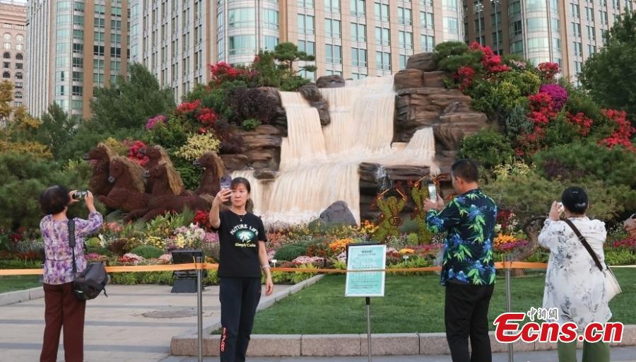 Visitors pose for pictures in front of a flower basket at Tiananmen Square in Beijing on Sept. 28, 2025. (Photo: China News Service/Yang Yuran)