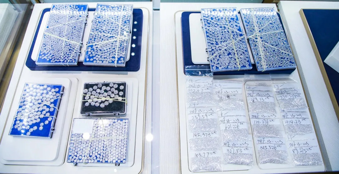 Semi-finished diamond products are displayed. (Photo courtesy of the lab-grown diamond branch of the Gems & Jewelry Trade Association of China)