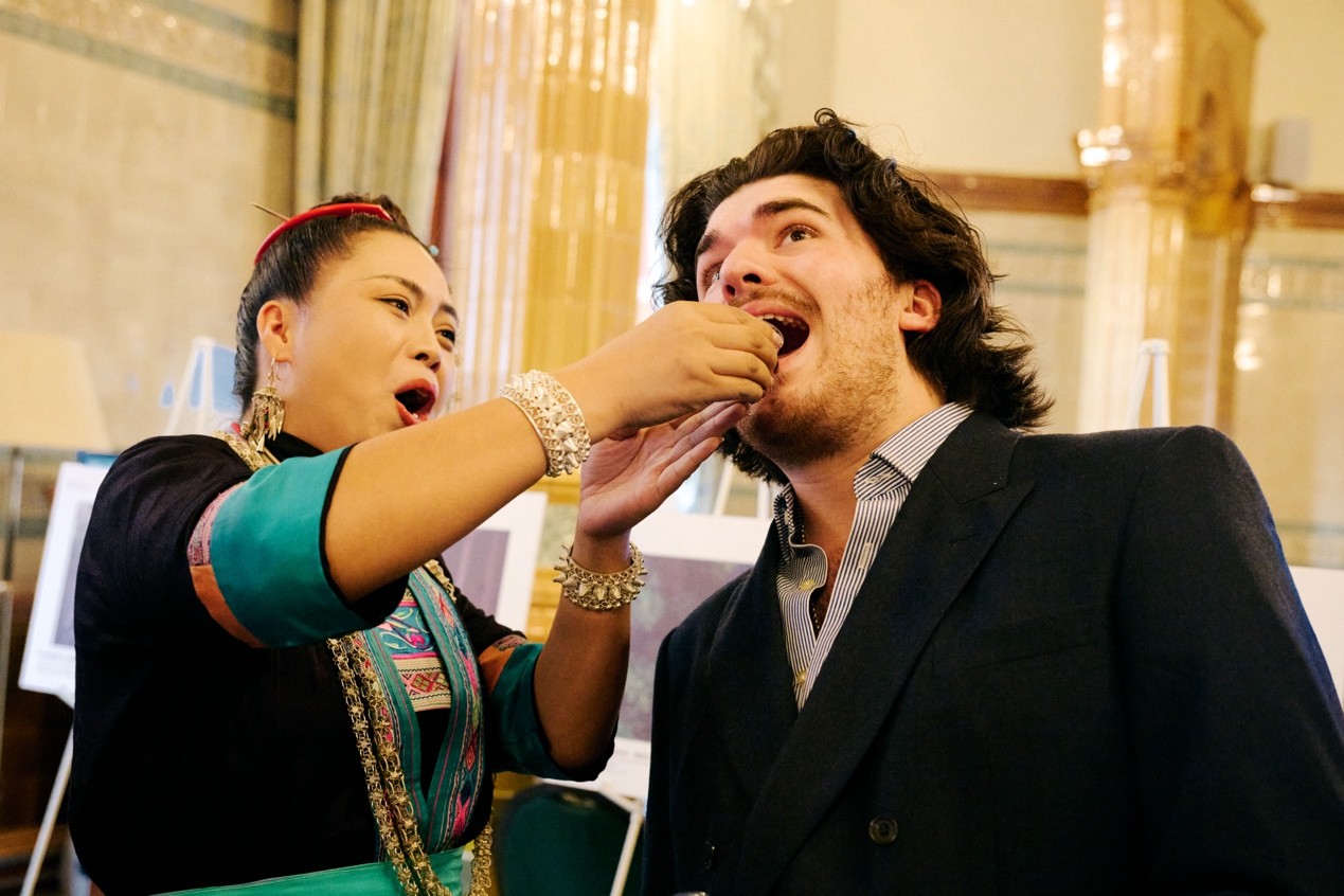 At the end of the event, Wu Yongqin, a Dong ethnic singer from the Guizhou Provincial Song and Dance Theatre, holding a wine cup, started singing a toast song. Wu successively sang three toast songs from the Dong, Miao, and Yi ethnic groups. Her clear voice, accompanied by the gentle sound of silver ornaments, conveyed respect as she offered toasts to the British guests. Although the guests did not understand the lyrics, they all responded warmly.