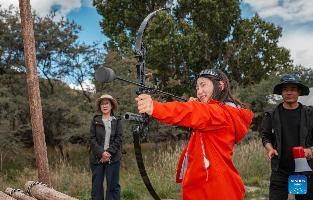 Tourists try an archery game at a "Lingka" festival in Qonggyai County of Shannan, southwest China's Xizang Autonomous Region, on Sept. 13, 2025.(Xinhua/Tenzin Nyida)