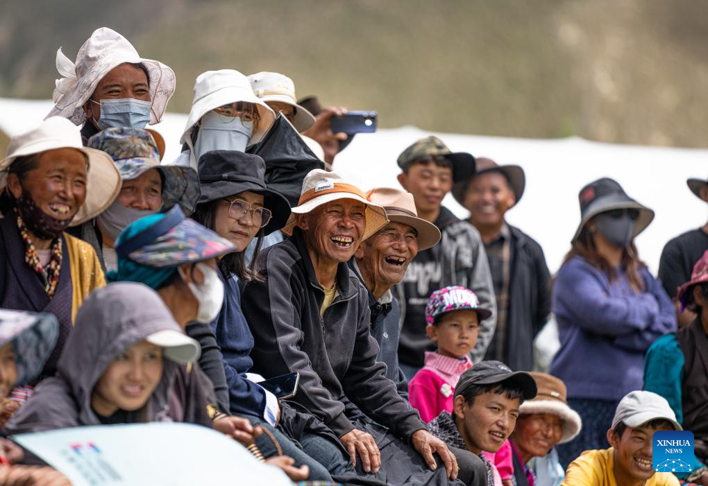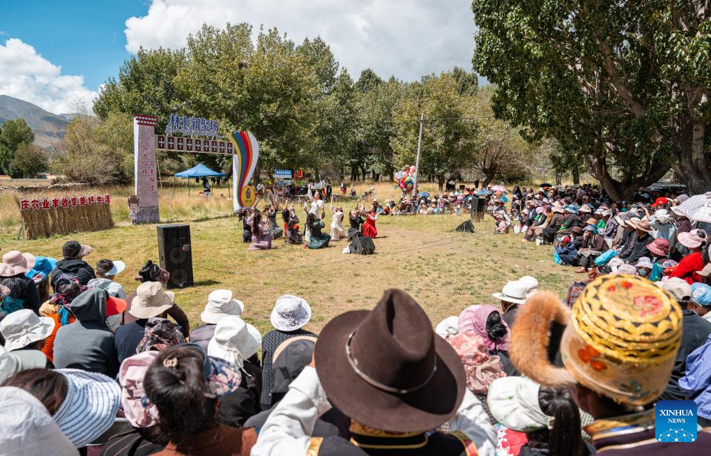 Local residents watch a performance at a "Lingka" festival in Qonggyai County of Shannan, southwest China's Xizang Autonomous Region, on Sept. 13, 2025.(Xinhua/Tenzin Nyida)