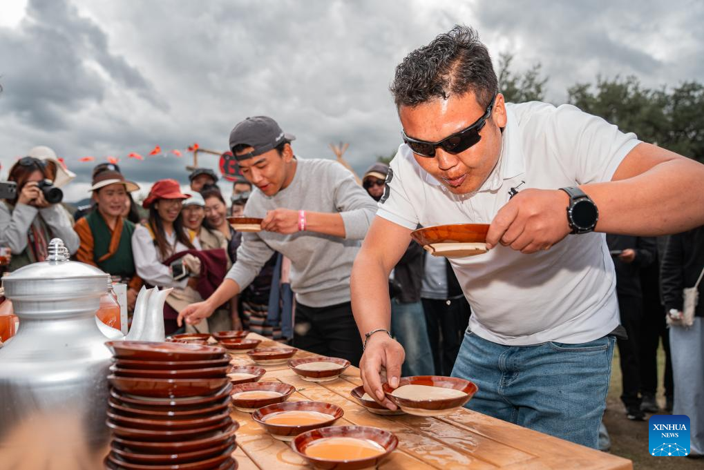 Local residents drink highland barley wine at a "Lingka" festival in Qonggyai County of Shannan, southwest China's Xizang Autonomous Region, on Sept. 13, 2025.(Xinhua/Tenzin Nyida)