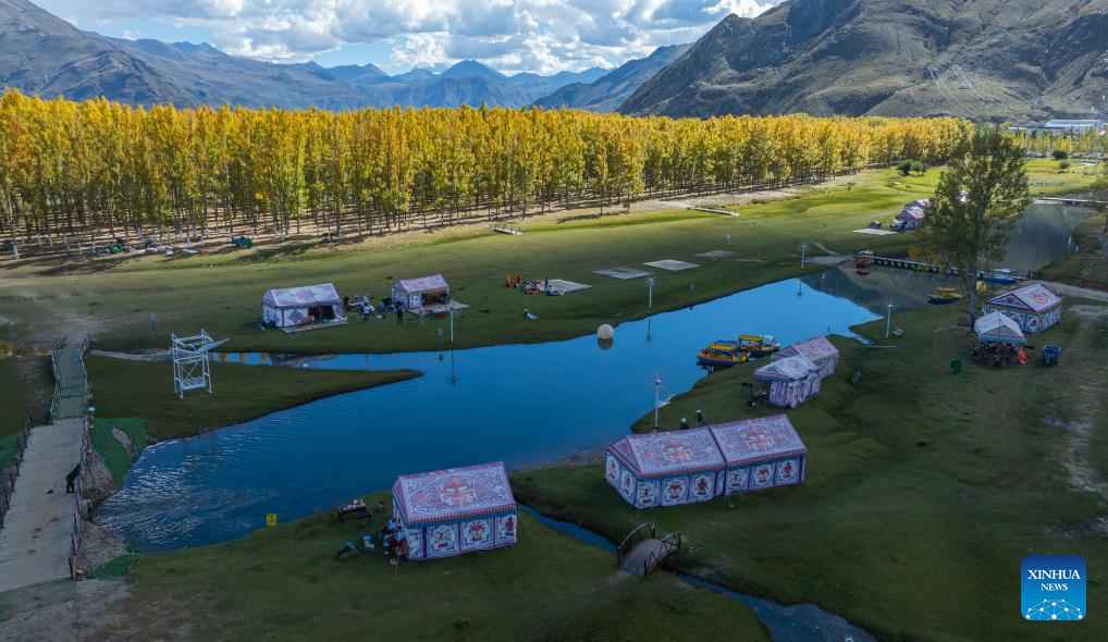 An aerial drone photo taken on Sept. 27, 2025 shows a view of a "Lingka" camping site in Lhunzhub County of Lhasa, southwest China's Xizang Autonomous Region.(Xinhua/Tenzin Nyida)