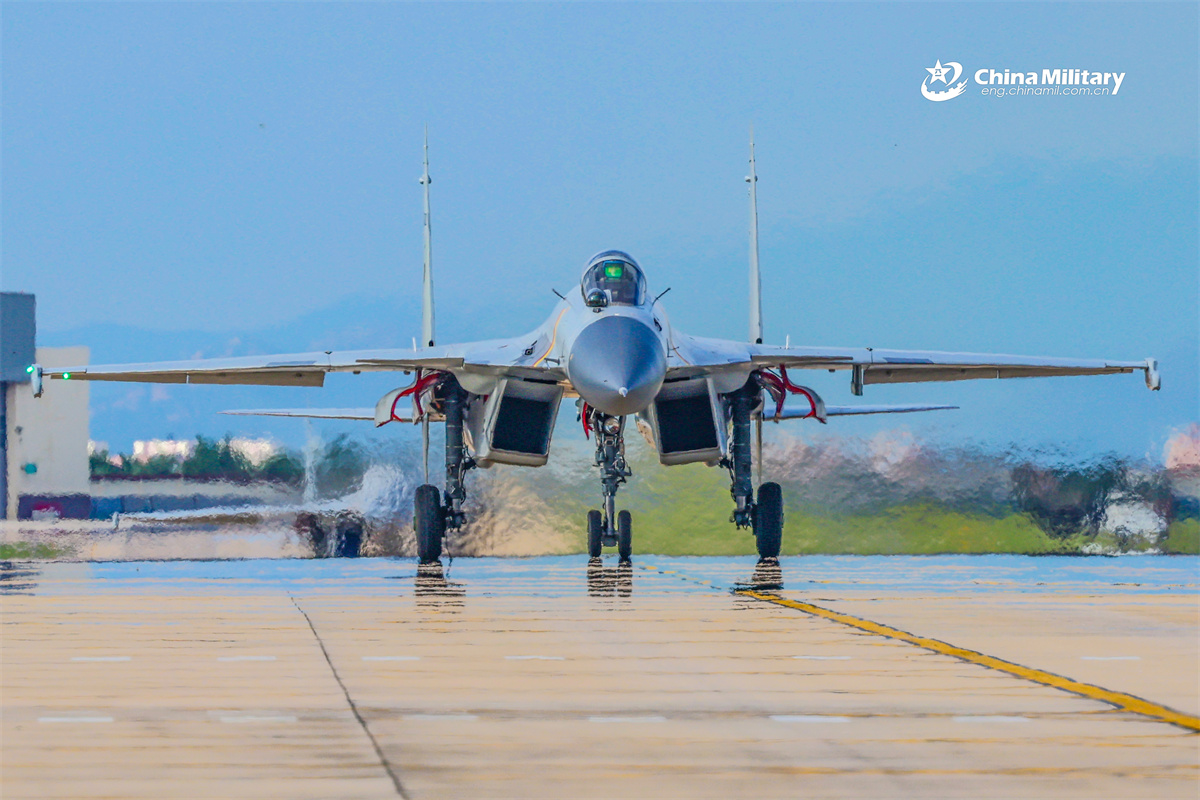 A J-15 carrier-based fighter jet attached to the Chinese PLA Naval Aviation University taxies on the flightline before takeoff for a flight training exercise in mid September, 2025. (eng.chinamil.com.cn/Photo by Jiang Tao)