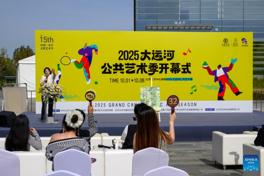 People take part in an art auction of the 2025 Grand Canal Public Art Season in Beijing, capital of China, Oct. 1, 2025. The 2025 Grand Canal Public Art Season kicked off here on Wednesday, enabling the public to experience the charm of art through interactive experiences. (Xinhua/Jin Liangkuai)