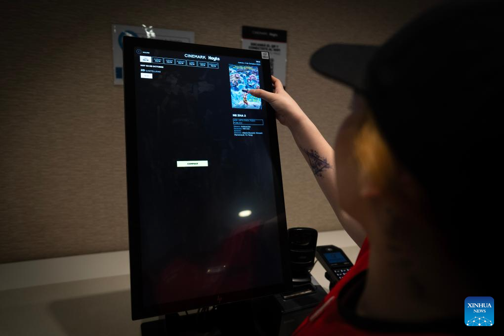 A ticket seller works at a box office for the Chinese animated film "Ne Zha 2" in a cinema in Buenos Aires, Argentina, on Oct. 2, 2025. Chinese animated film "Ne Zha 2" held its premiere in the Argentine capital Buenos Aires on Thursday. (Photo by Martin Zabala/Xinhua)