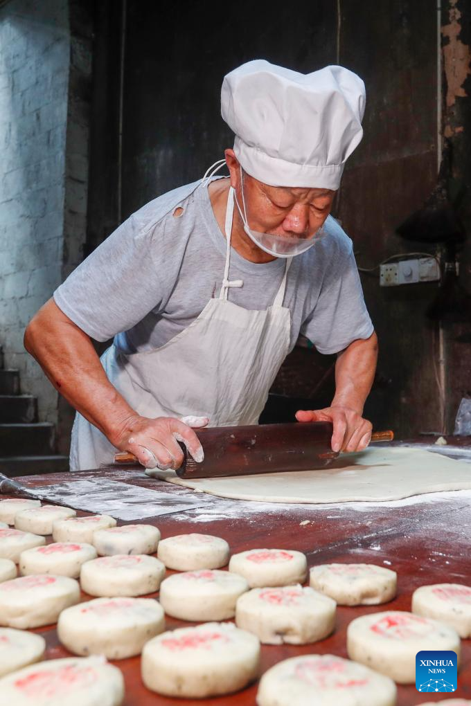 Pastry artisan Cheng Guisheng makes "Huizhou-style Sesame Seed Mooncakes" at Wan'an Old Street in Xiuning County of Huangshan City, east China's Anhui Province, Sept. 25, 2025.(Photo by Shi Yalei/Xinhua)
