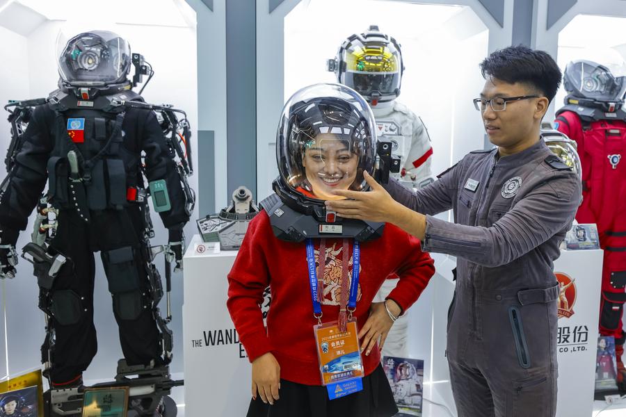 A visitor tries a space helmet originating from "The Wandering Earth", a Chinese sci-fi blockbuster, during the 81st World Science Fiction Convention (WorldCon) in Chengdu, southwest China's Sichuan Province, Oct. 18, 2023. (Xinhua/Shen Bohan)