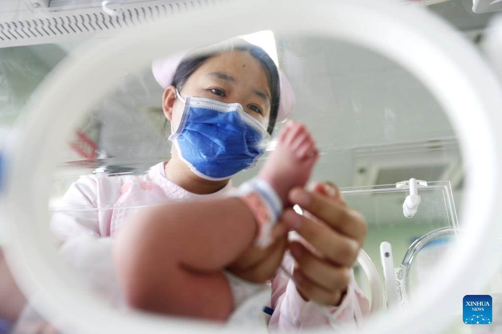 A medical worker takes care of a baby at a hospital in Lianyungang, east China's Jiangsu Province, Oct. 6, 2025. Many workers have been standing fast at their posts and fulfilling their duties during the eight-day National Day and Mid-Autumn Festival holiday. (Photo by Wang Chun/Xinhua)