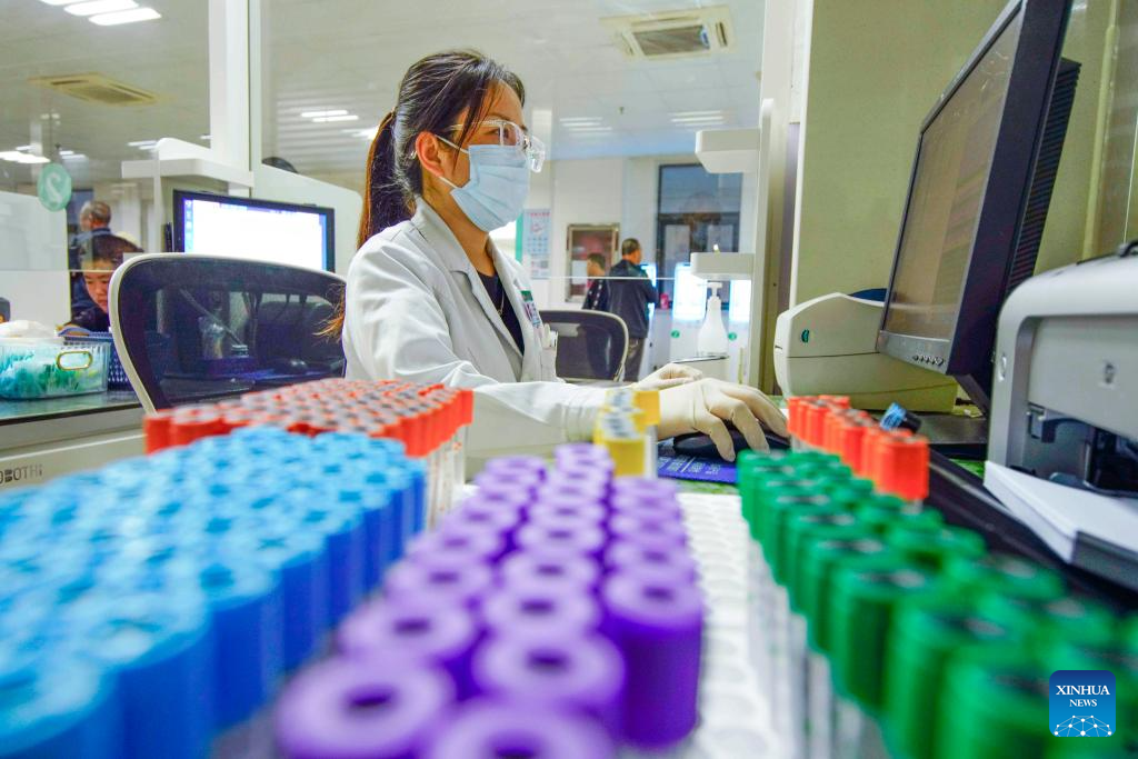 A doctor works at the laboratory department of a hospital in Zunhua, north China's Hebei Province, Oct. 6, 2025. Many workers have been standing fast at their posts and fulfilling their duties during the eight-day National Day and Mid-Autumn Festival holiday. (Photo by Liu Mancang/Xinhua)