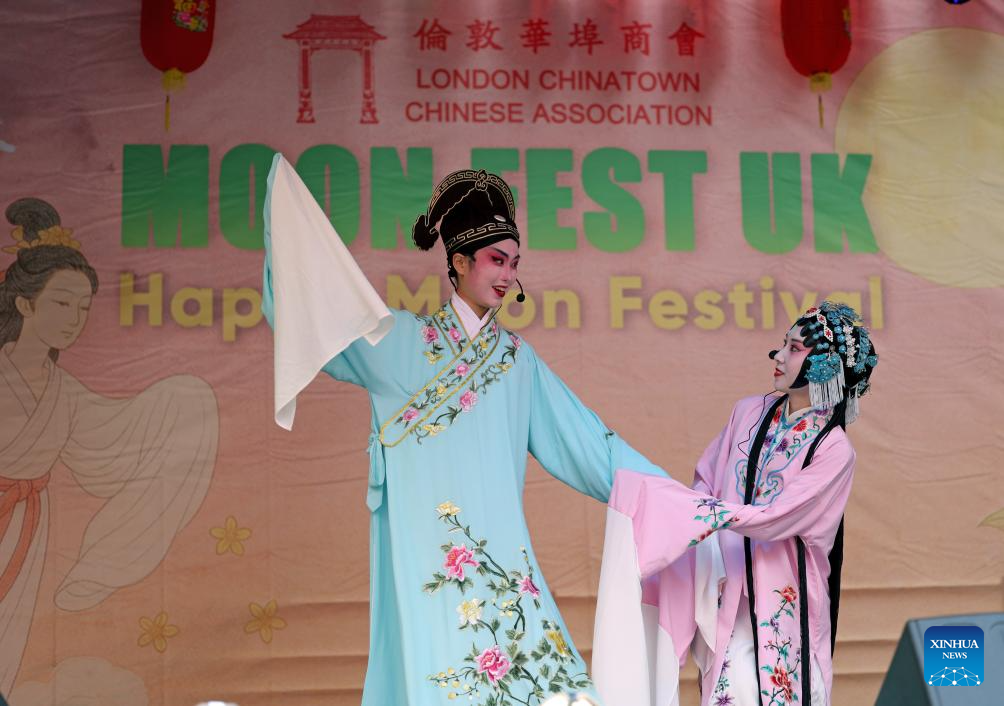 Artists perform at a show for the celebration of the Chinese Mid-Autumn Festival in London, Britain, Oct. 5, 2025. A show for the celebration of the Chinese Mid-Autumn Festival was staged in London Chinatown on Sunday afternoon, impressing many with performances featuring Chinese culture and art. (Xinhua/Li Ying)