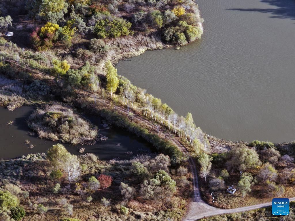 An aerial drone photo taken on Oct. 7, 2025 shows the autumn scenery of the Jinhewan wetland park in Harbin, northeast China's Heilongjiang Province. With abundant wetland resources, Harbin has been vigorously constructing wetland tourism area for leisure travel to tap its unique natural and historical resources. (Xinhua/Wang Song)