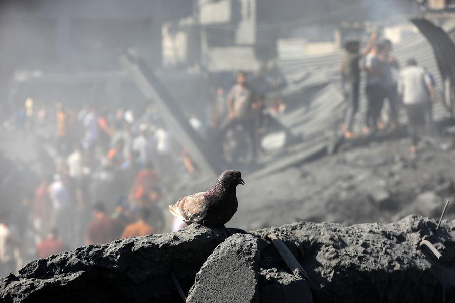 A pigeon is pictured among the rubble of buildings destroyed in Israeli airstrikes in the southern Gaza Strip city of Khan Younis, on Oct. 26, 2023. (Photo by Yasser Qudih/Xinhua)