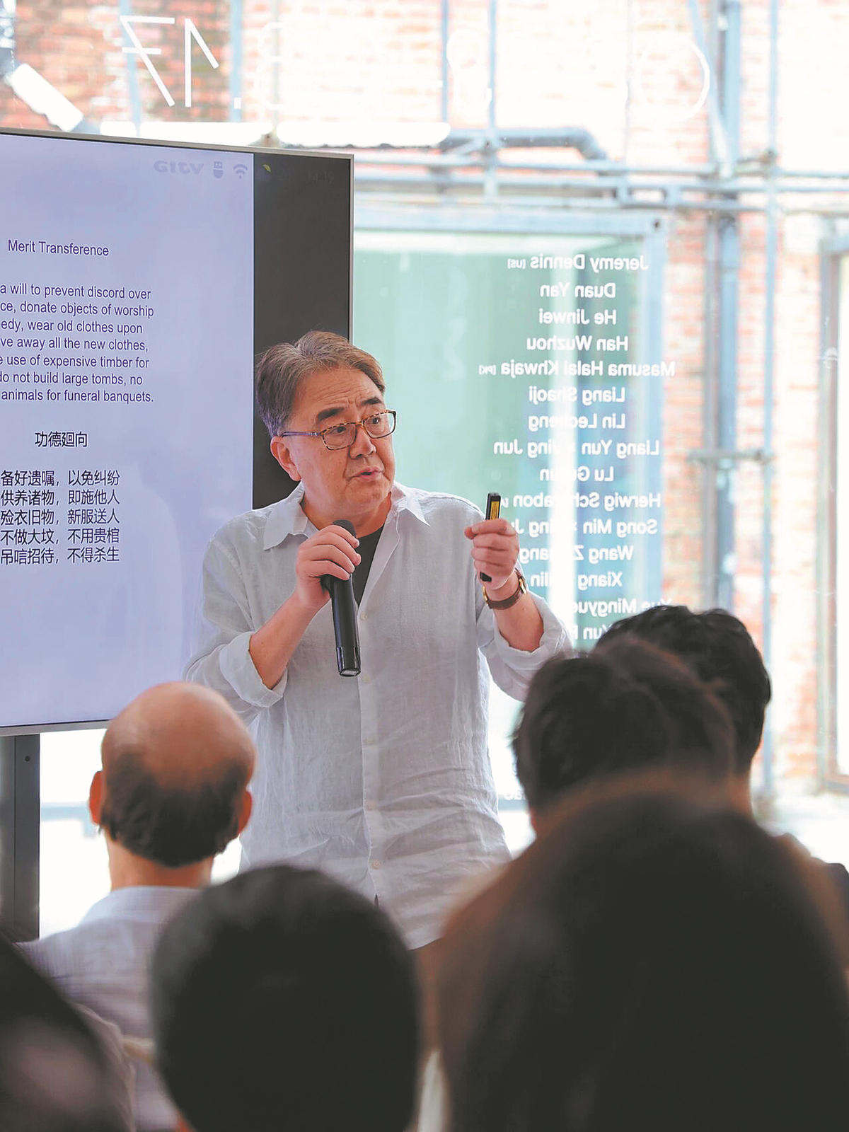 Professor Jing Jun, the academic supporter of the exhibition, delivers a speech at the event on June 29 at the 798 Art Zone in Beijing. (CHINA DAILY)
