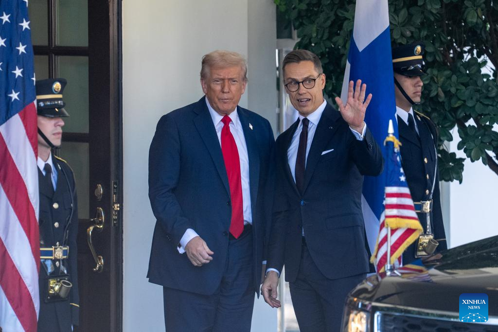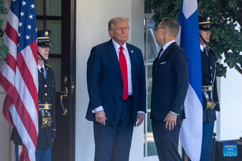 U.S. President Donald Trump (2nd L) welcomes Finnish President Alexander Stubb (2nd R) at the White House in Washington, D.C., the United States, Oct 9, 2025. (Xinhua/Hu Yousong)