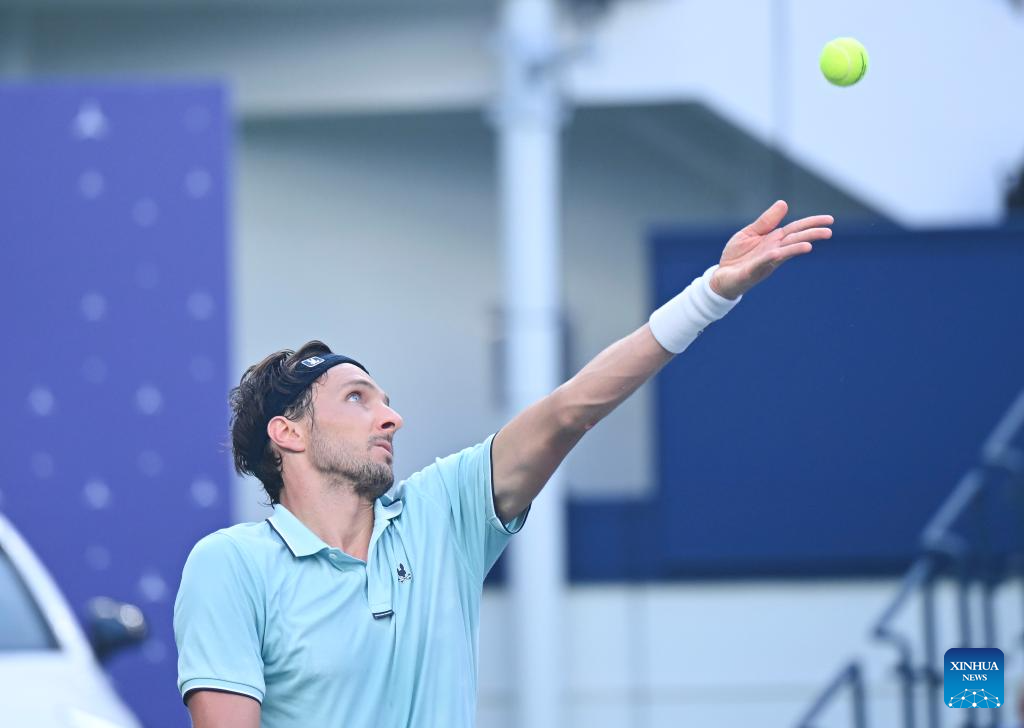 Arthur Rinderknech of France serves to Felix Auger-Aliassime of Canada during the men's singles quarterfinal at the ATP World Tour Shanghai Masters tennis tournament in Shanghai, east China, Oct. 10, 2025. (Xinhua/Wang Xiang)