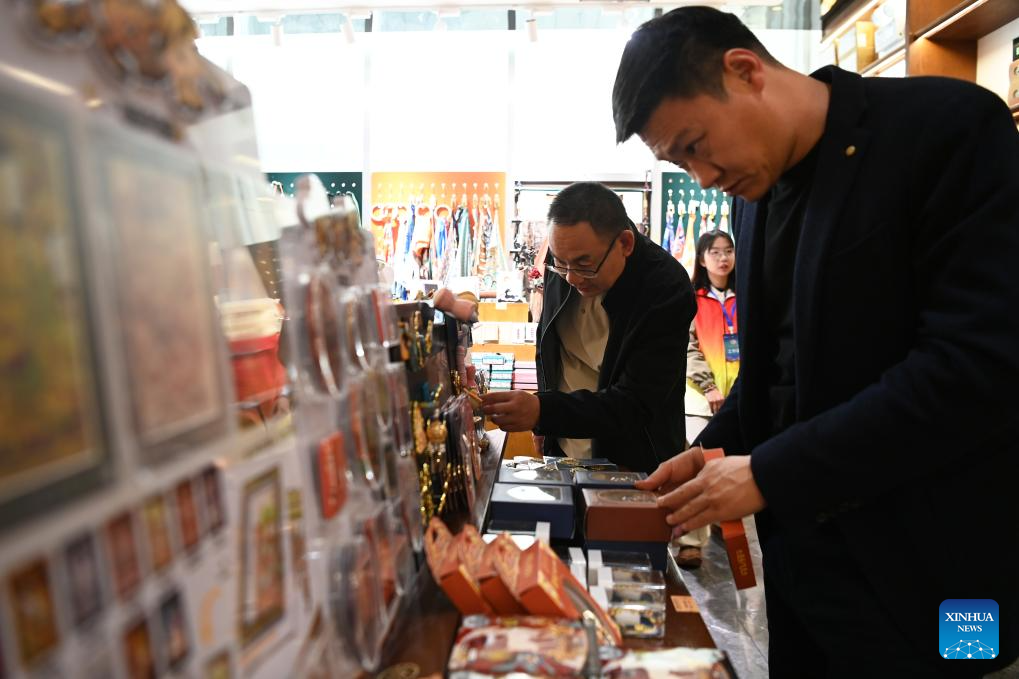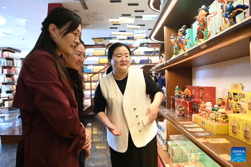Tourists select cultural and creative products at the Dunhuang Book Center in Dunhuang, northwest China's Gansu Province, Oct. 11, 2025. In recent years, Dunhuang has advanced the development of immersive cultural and tourism experience projects. By renovating unused buildings, new cultural landmarks centered on Dunhuang culture have been created, including the Dunhuang Book Center, Dunhuang Press, and Dunhuang Unbounded art gallery. These cultural attractions combining cultural consumption, art exhibitions, interactive experiences, and social activities attract a large number of visitors. (Xinhua/Fan Peishen)