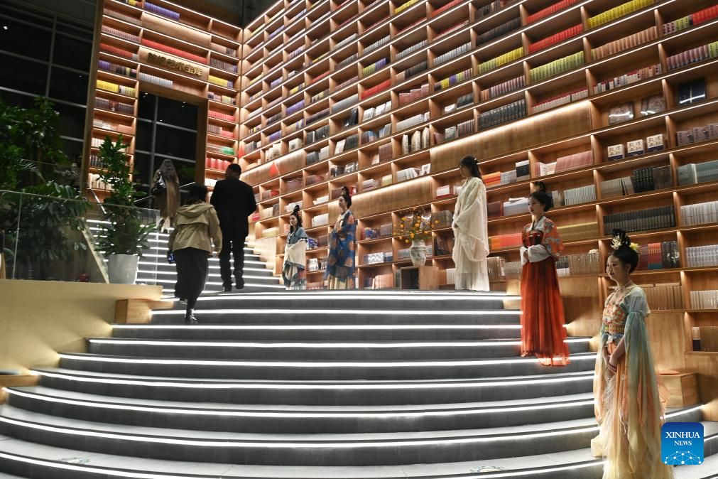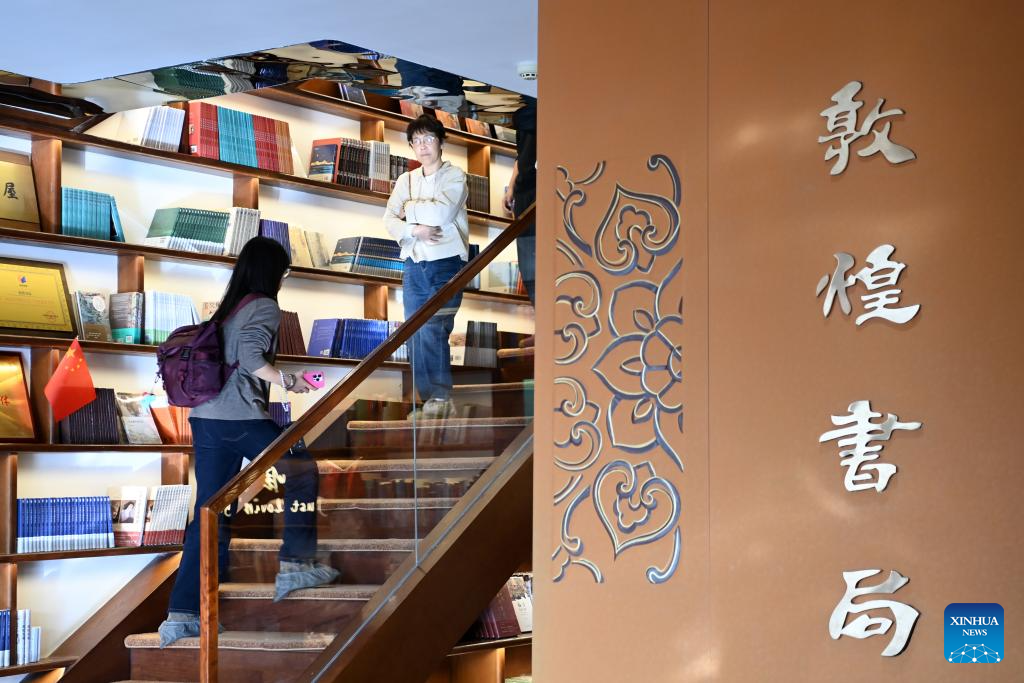 Tourists visit the Dunhuang Book Center in Dunhuang, northwest China's Gansu Province, Oct. 11, 2025. In recent years, Dunhuang has advanced the development of immersive cultural and tourism experience projects. By renovating unused buildings, new cultural landmarks centered on Dunhuang culture have been created, including the Dunhuang Book Center, Dunhuang Press, and Dunhuang Unbounded art gallery. These cultural attractions combining cultural consumption, art exhibitions, interactive experiences, and social activities attract a large number of visitors. (Xinhua/Fan Peishen)