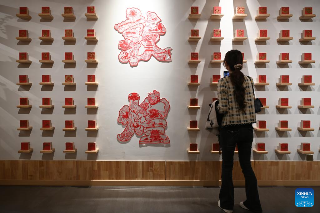 Tourists try stamping at the Dunhuang Press in Dunhuang, northwest China's Gansu Province, Oct. 11, 2025. In recent years, Dunhuang has advanced the development of immersive cultural and tourism experience projects. By renovating unused buildings, new cultural landmarks centered on Dunhuang culture have been created, including the Dunhuang Book Center, Dunhuang Press, and Dunhuang Unbounded art gallery. These cultural attractions combining cultural consumption, art exhibitions, interactive experiences, and social activities attract a large number of visitors. (Xinhua/Fan Peishen)