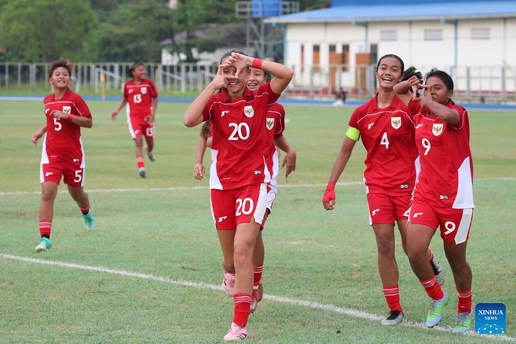 Players of Indonesia celebrate scoring during the AFC U17 Women's Asian Cup 2026 China 2026 qualifier between China's Macao and Indonesia in Yangon, Myanmar, Oct. 13, 2025. (Xinhua/Myo Kyaw Soe)