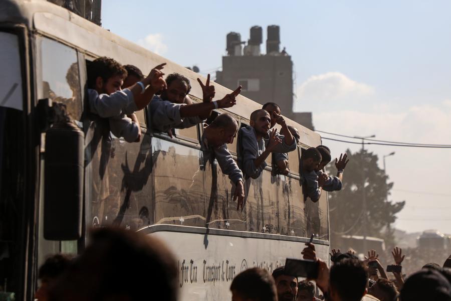 People welcome released Palestinian prisoners at Nasser Medical Complex in the southern city of Khan Younis, on Oct. 13, 2025. (Photo by Rizek Abdeljawad/Xinhua)