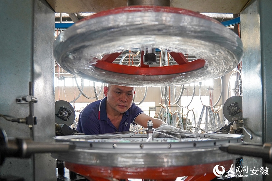 A worker makes bicycle parts at a workshop in the bicycle industrial park in Wuhe county, Bengbu city, east China's Anhui Province. (People's Daily Online/Chen Ruotian)