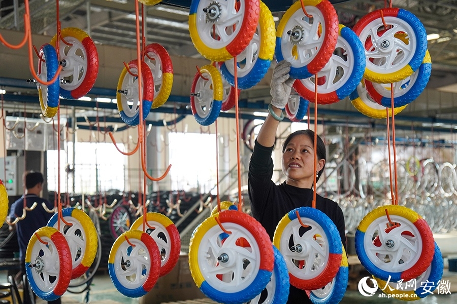 Workers make bicycle parts at a workshop in the bicycle industrial park in Wuhe county, Bengbu city, east China's Anhui Province. (People's Daily Online/Chen Ruotian)