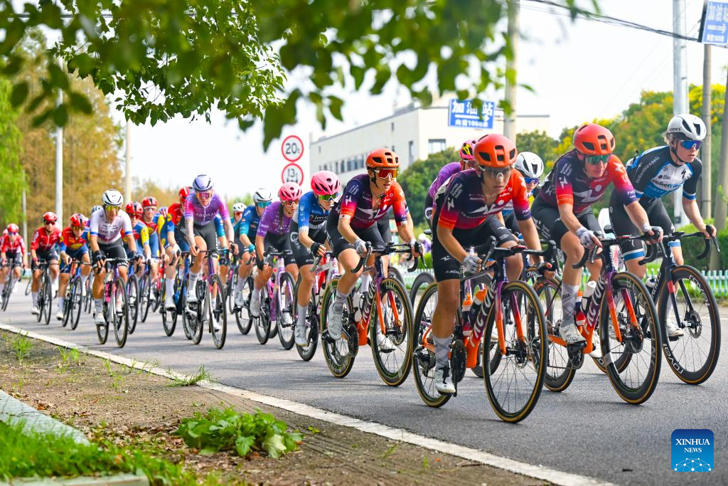 Cyclists compete during the Stage 2 of the UCI Women's WorldTour Tour of Chongming Island road cycling race in Shanghai, east China, Oct. 15, 2025. (Xinhua/Chen Haoming)