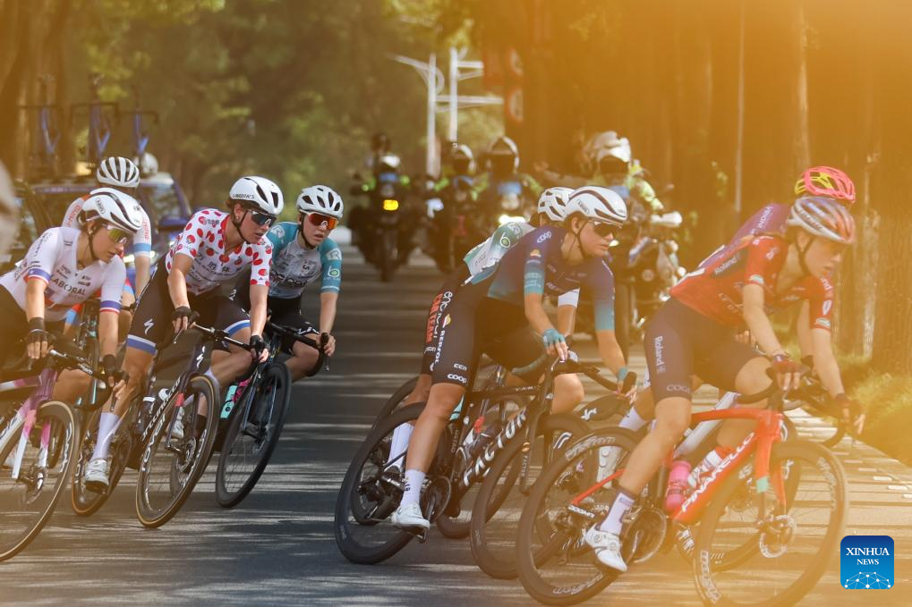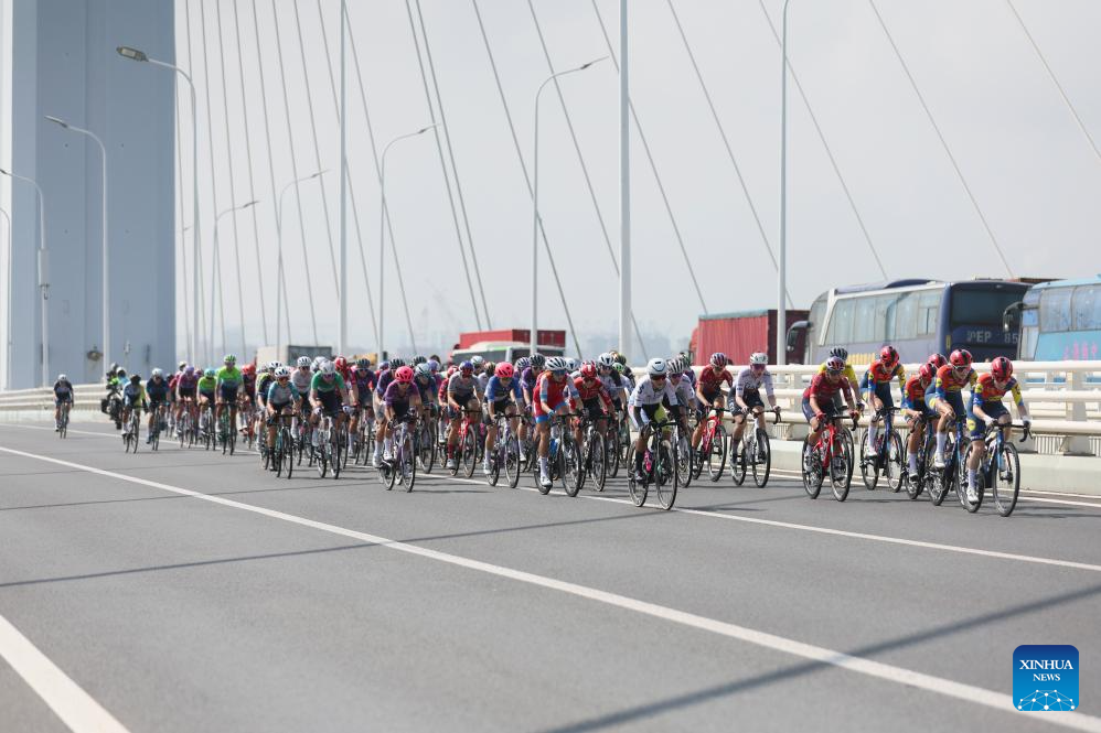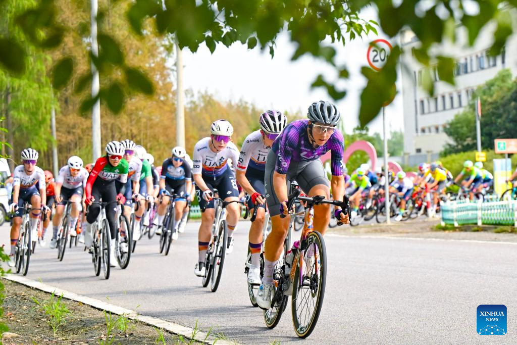 Cyclists compete during the Stage 2 of the UCI Women's WorldTour Tour of Chongming Island road cycling race in Shanghai, east China, Oct. 15, 2025. (Xinhua/Wang Xiang)